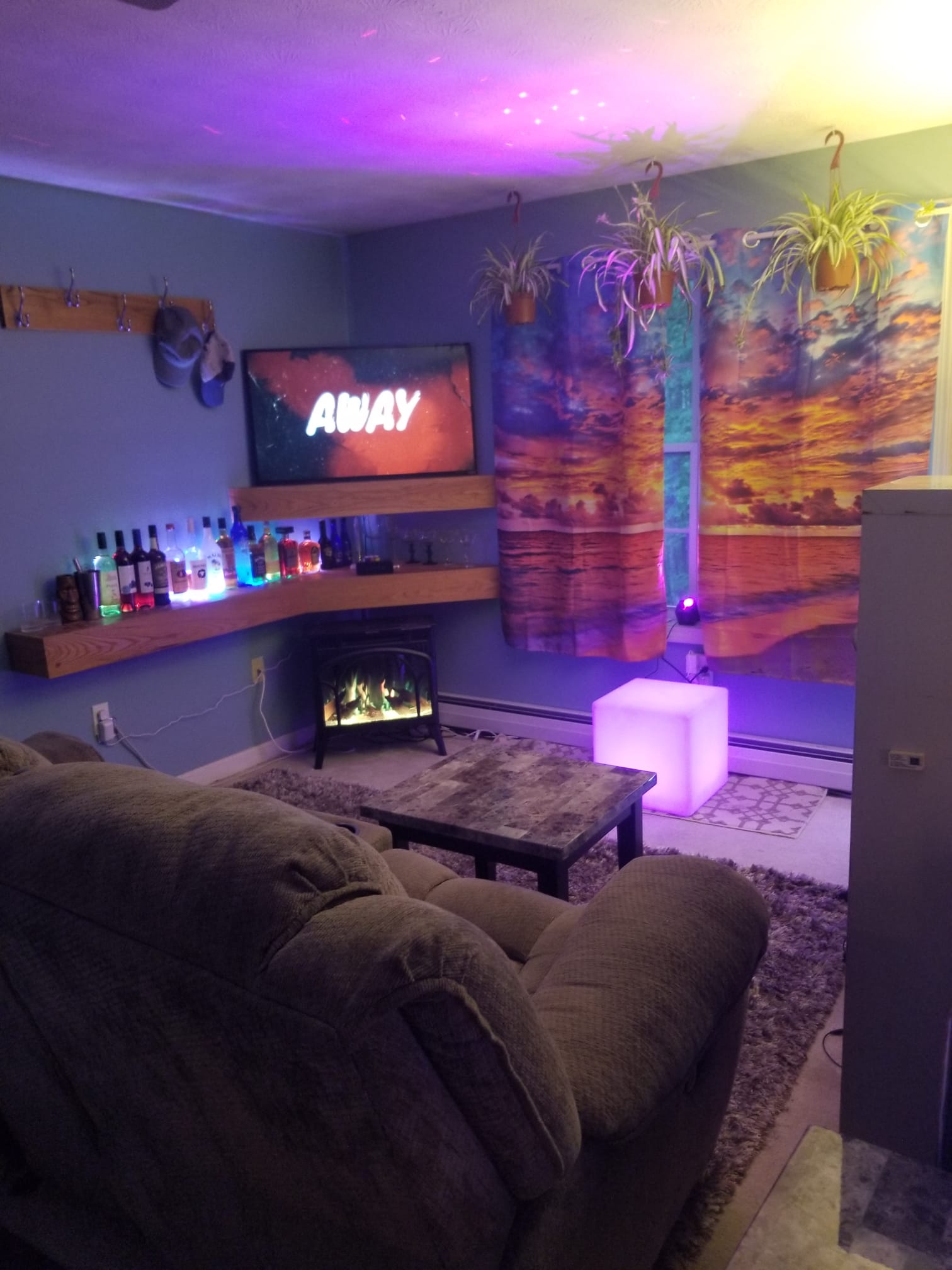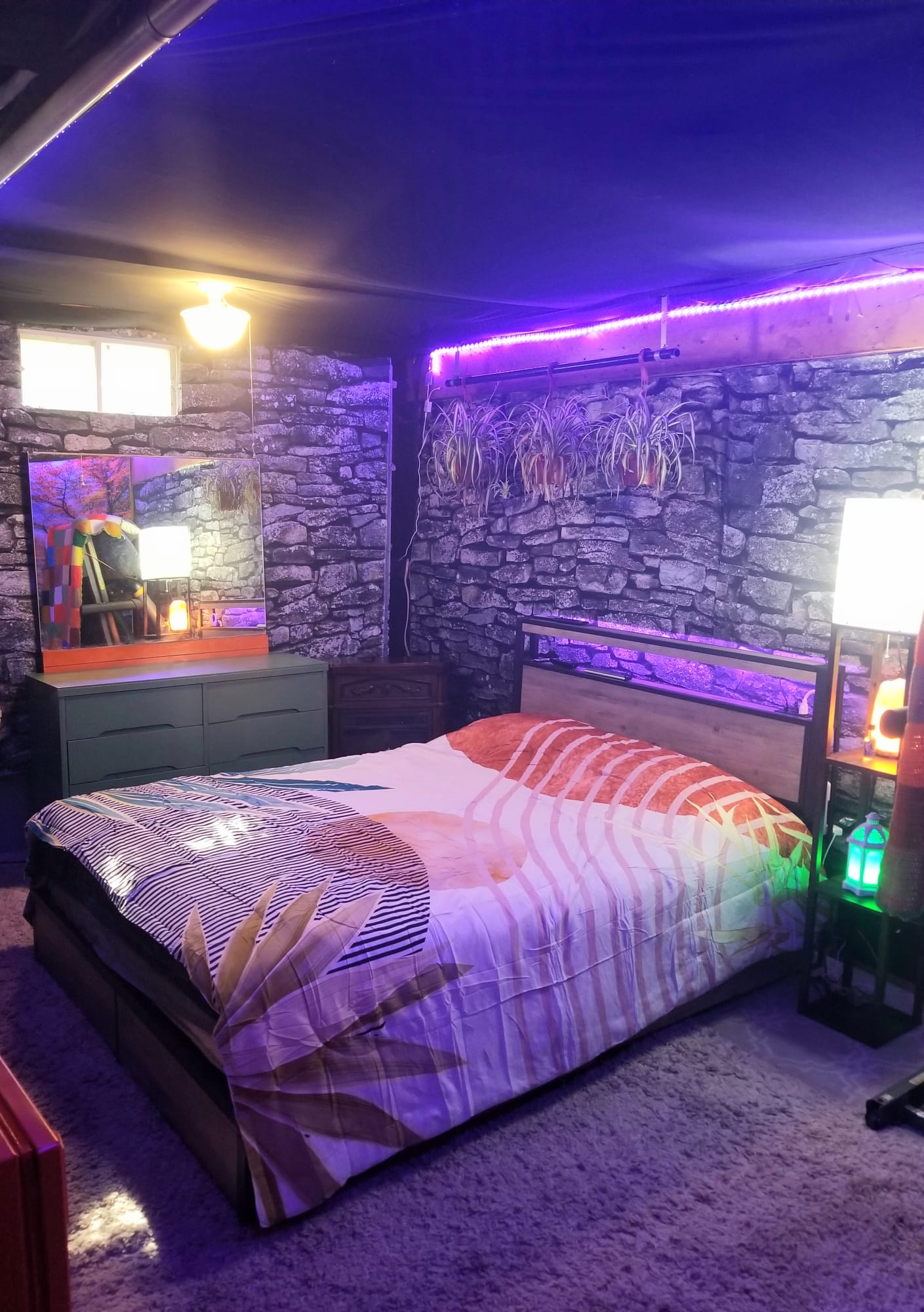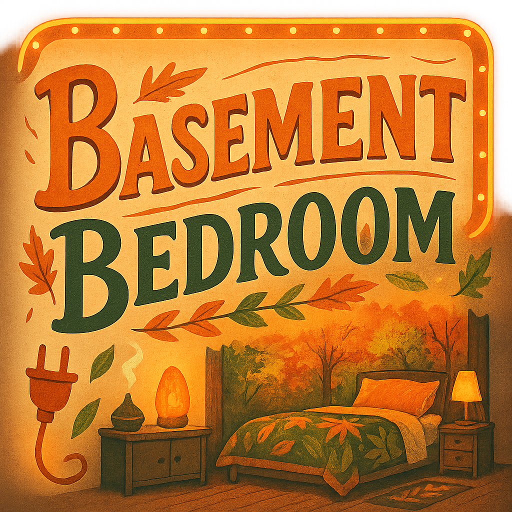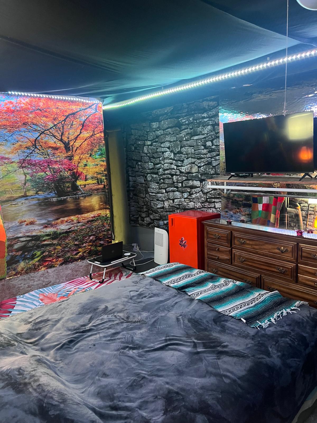 The Autumn Room is a cozy hideaway wrapped in peak-foliage vibes. A giant mural of blazing leaves anchors the space, while a powerful electric heater warms it quickly. Two large mirrors, including a standup mirror, bounce the glow of a salt lamp and essential oil diffuser. Colorful LED strip lighting traces the ceiling, with accent lighting along the bed. The headboard includes charging outlets for phones and tablets. Orange and green tones pair with a boho foliage bedspread and matching runner. Storage is abundant: a secret cubby, two bureaus, and under-bed drawers on both sides. A mini fridge keeps drinks frosty for movie nights, and the TV sits directly in view from the pillows with streaming apps preloaded. A treadmill and pull-up bar invite quick workouts. A small window delivers sunlight, while a dehumidifier keeps the air crisp. Located in the basement, it has its own private entrance through the mancave.