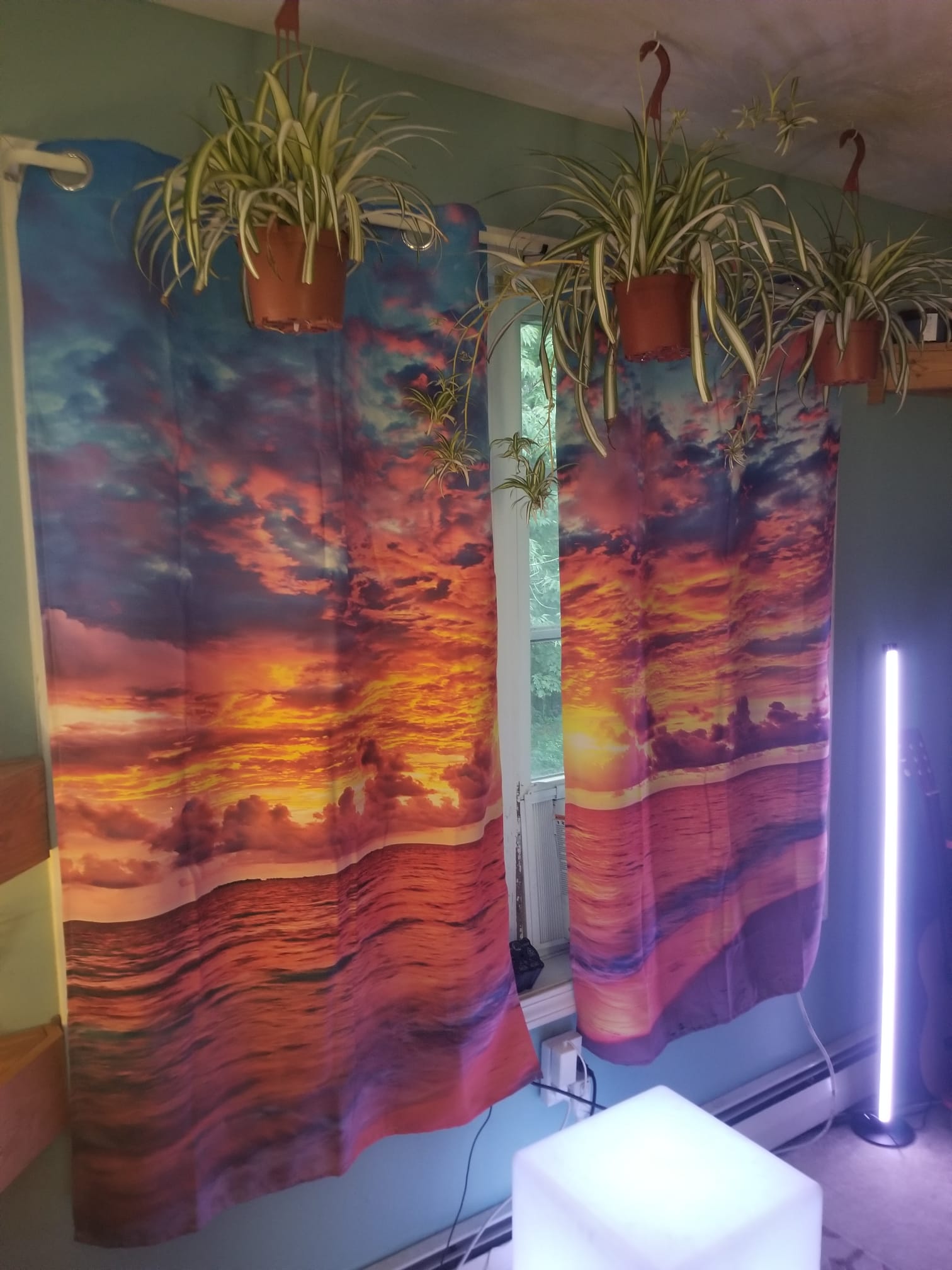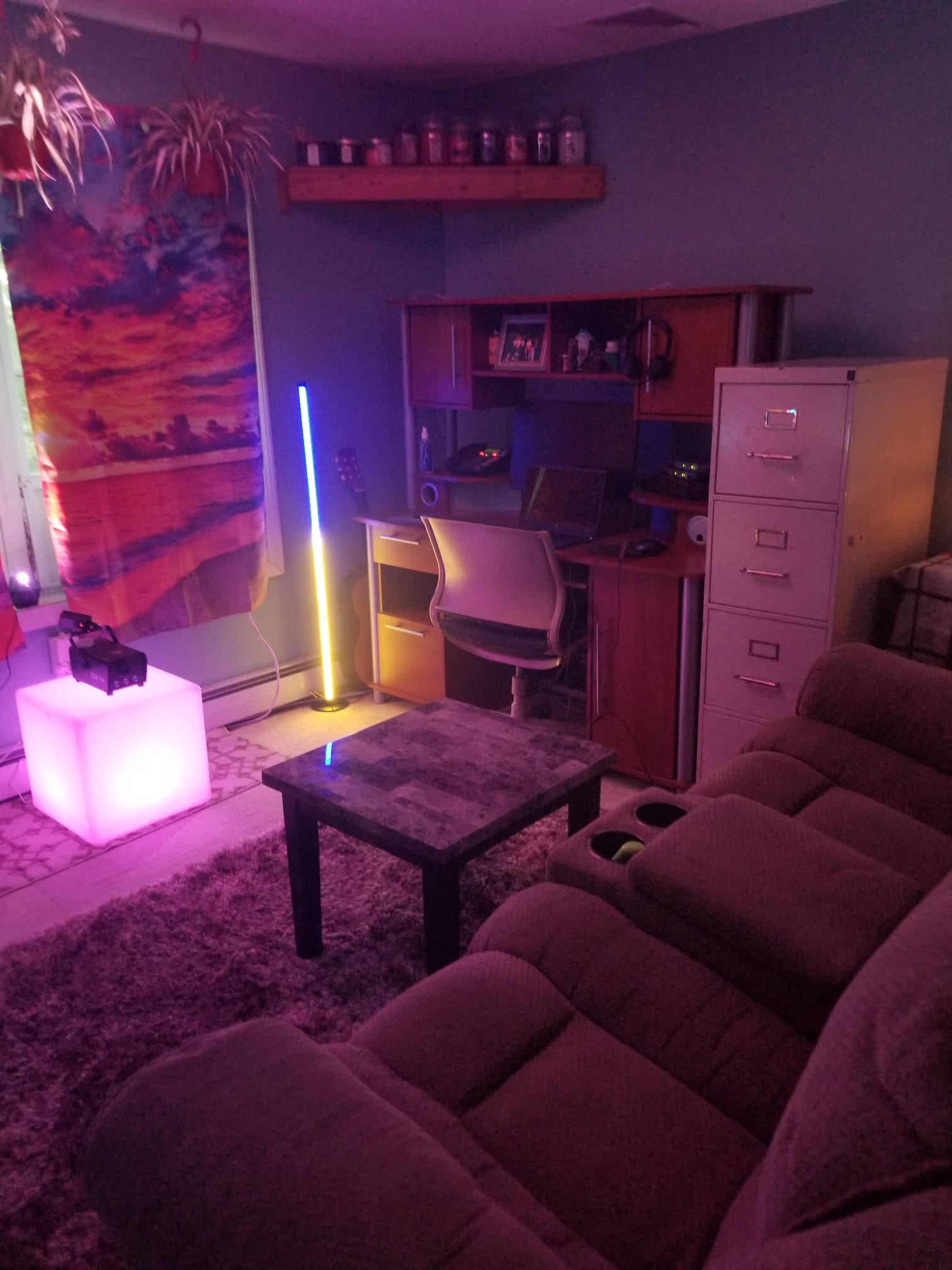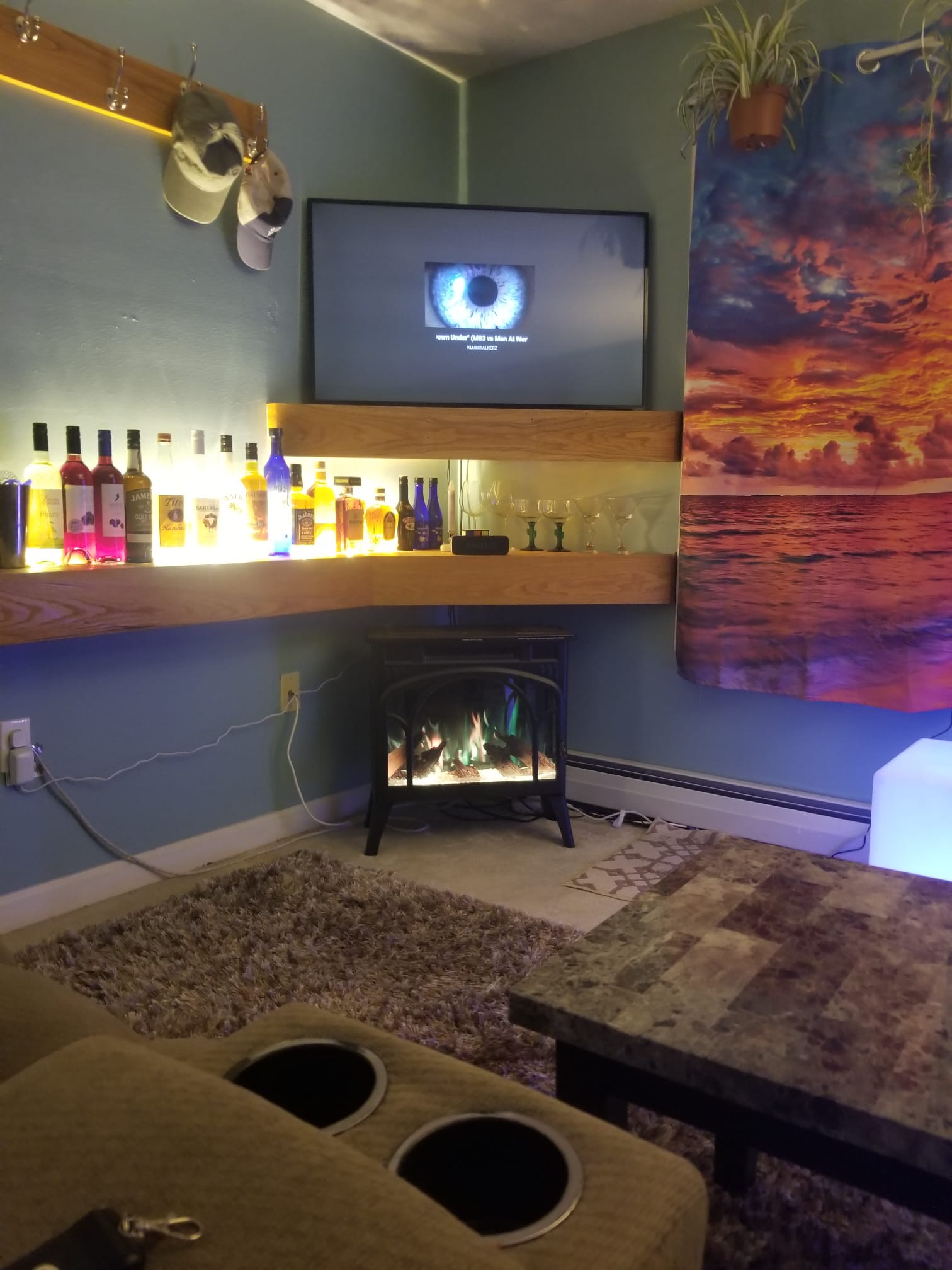 The Autumn Room is a cozy hideaway wrapped in peak-foliage vibes. A giant mural of blazing leaves anchors the space, while a powerful electric heater warms it quickly. Two large mirrors, including a standup mirror, bounce the glow of a salt lamp and essential oil diffuser. Colorful LED strip lighting traces the ceiling, with accent lighting along the bed. The headboard includes charging outlets for phones and tablets. Orange and green tones pair with a boho foliage bedspread and matching runner. Storage is abundant: a secret cubby, two bureaus, and under-bed drawers on both sides. A mini fridge keeps drinks frosty for movie nights, and the TV sits directly in view from the pillows with streaming apps preloaded. A treadmill and pull-up bar invite quick workouts. A small window delivers sunlight, while a dehumidifier keeps the air crisp. Located in the basement, it has its own private entrance through the mancave.