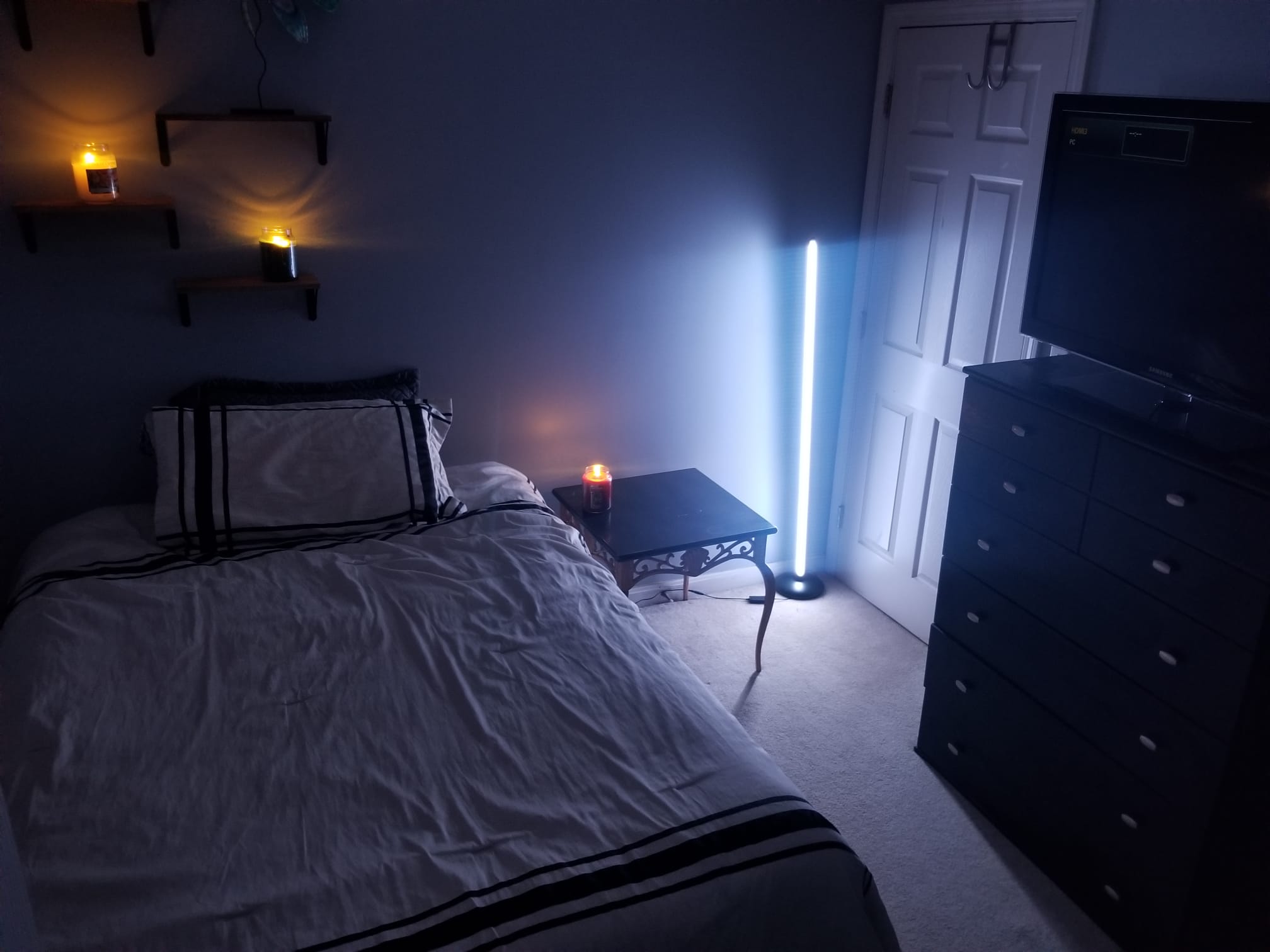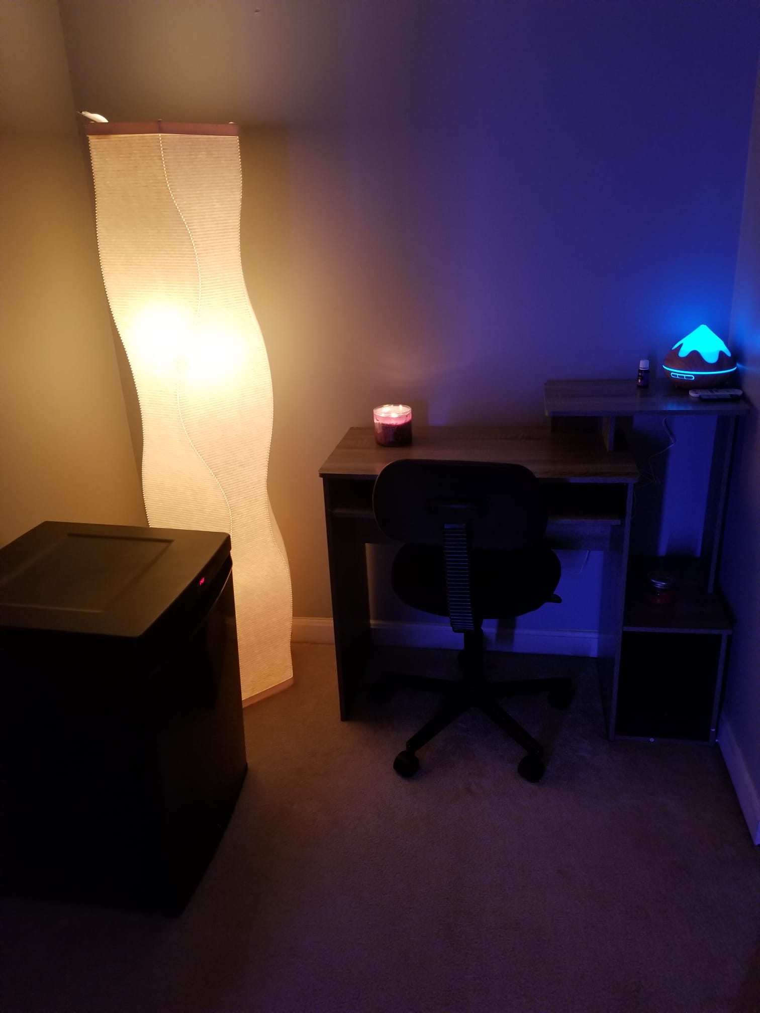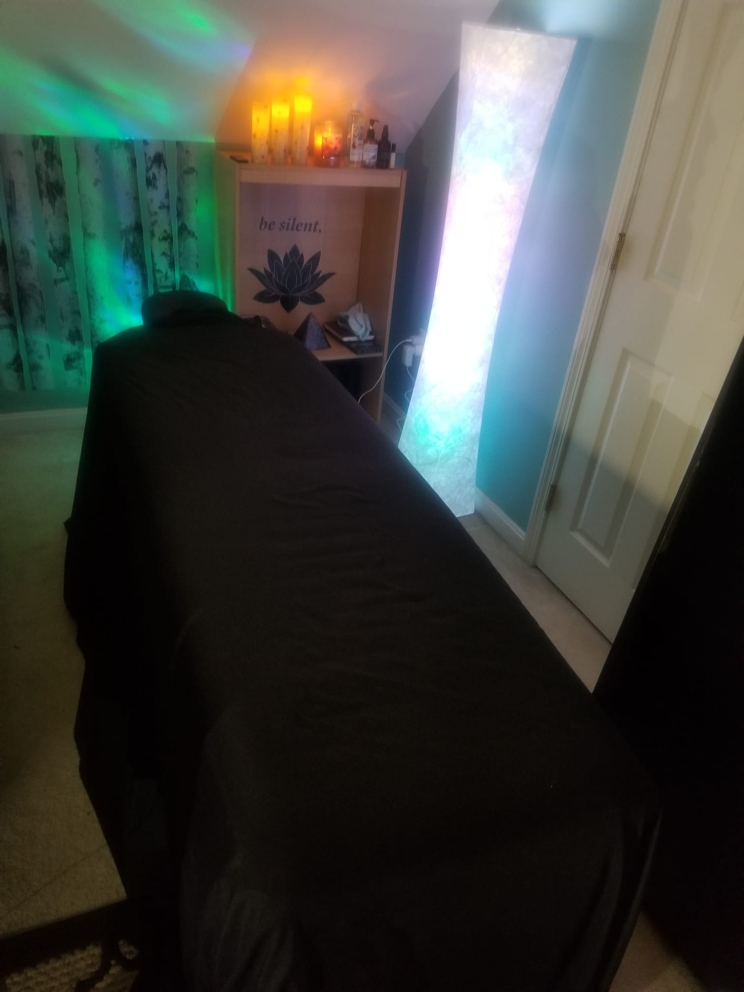 Soft ambient lighting enhances the mood: a sleek floor lamp shifts through gentle color tones, complemented by a long LED light strip that washes the space in customizable, calming hues. Small floating shelves offer charm and character, the perfect place for keepsakes, crystals, or curated décor. A large