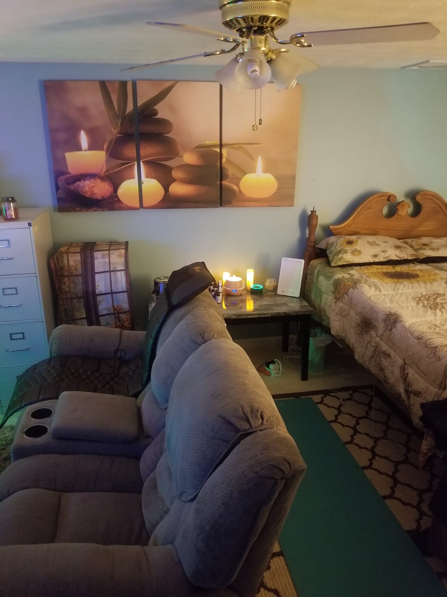 Wellness details are everywhere. The bed features Tempur Pedic pillows and grounding sheets that calm inflammation. An EMF blocker steadies the electromagnetic radiation. A sunrise simulator pairs with a sleep sound machine for bright mornings and restful nights. A yoga mat and compact workout gear live under the bed. In the spa corner, a full sized massage table and Brookstone massager deliver professional caliber relief, supported by flickering birch tree candles and soothing oils. Temperature is perfect with air conditioning, a ceiling fan, and quiet heating. Sunlight pours through the large window by day. At night the room becomes pure bliss.