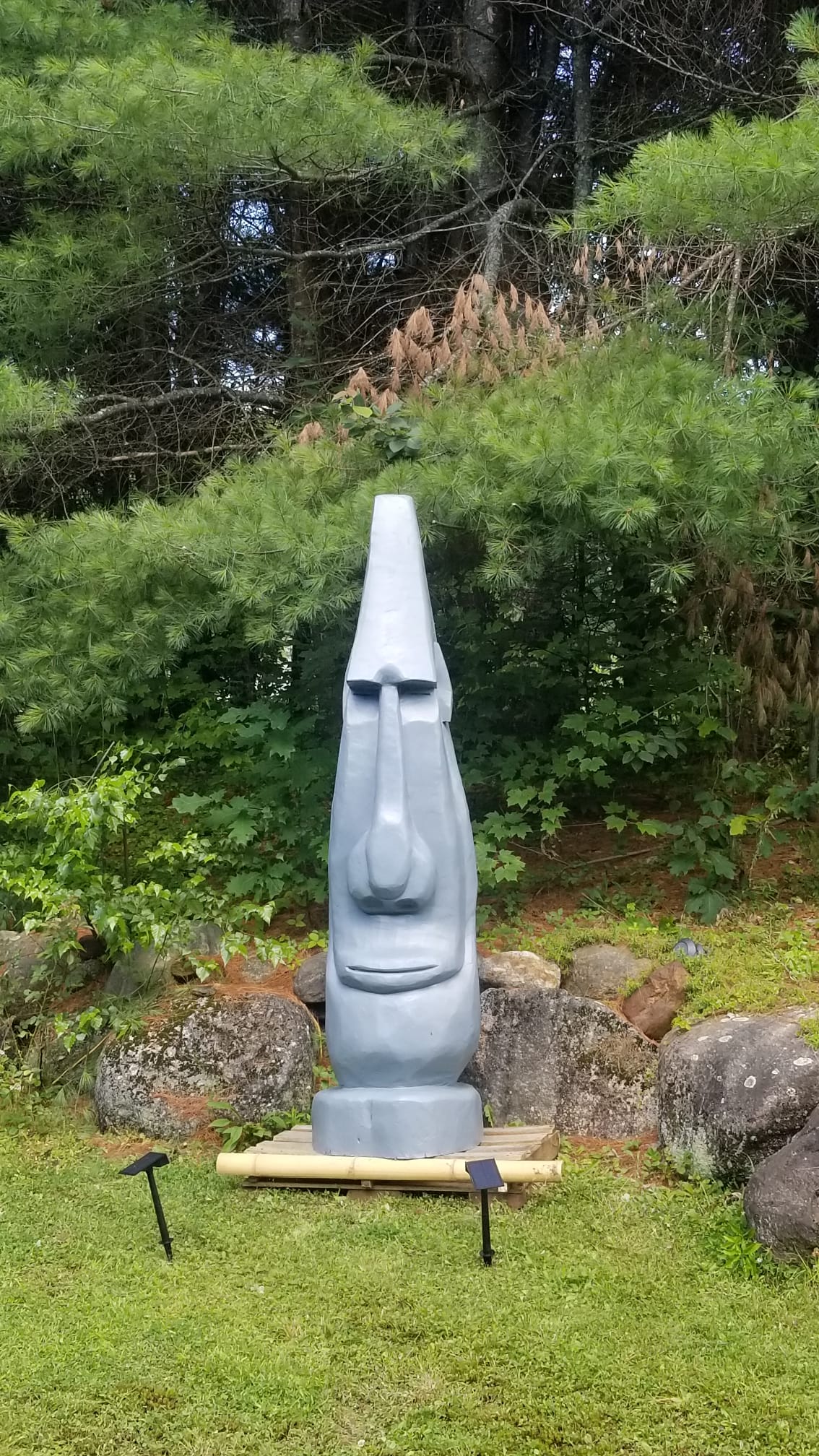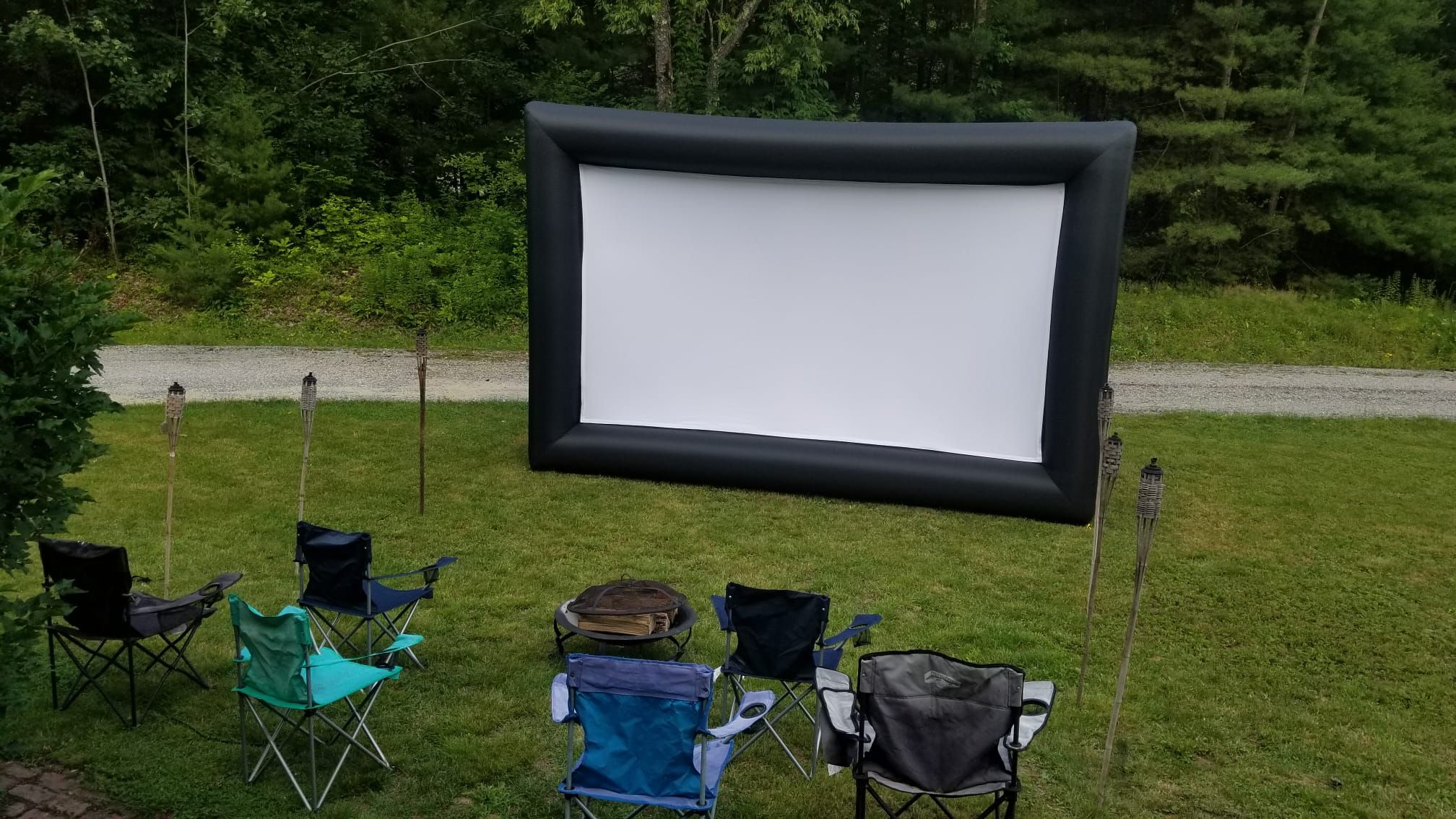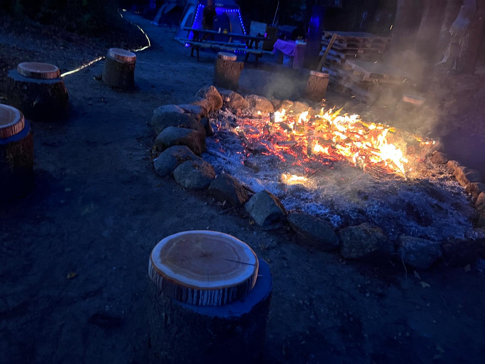 When the stars come alive, the property’s showpiece roars to life. One of the largest pallet burning bonfires in New Hampshire is stacked with care at the community ring. Flames lift like a lighthouse and everyone gathers with mugs, stories, and the happy crackle that settles the mind. The bonfire pit has tree stumps all around and the tree stumps have a tempurpedic foam cushions that look like tree stumps. Tiki torches keep a warm perimeter, citronella hums softly, and a playful strobe glances over silly cardboard cutouts and shy tree people for late night laughs.