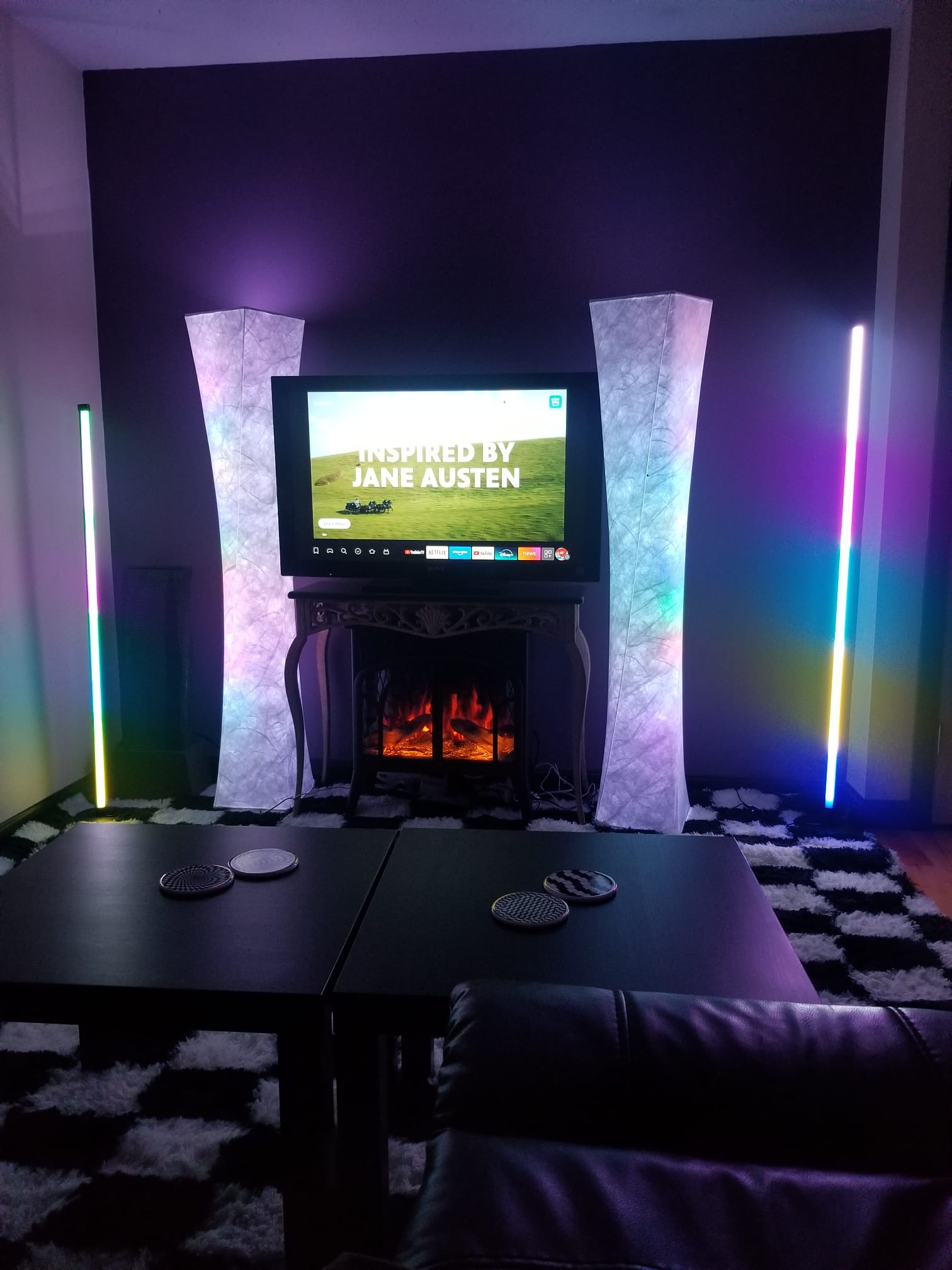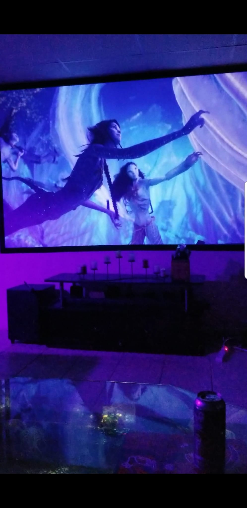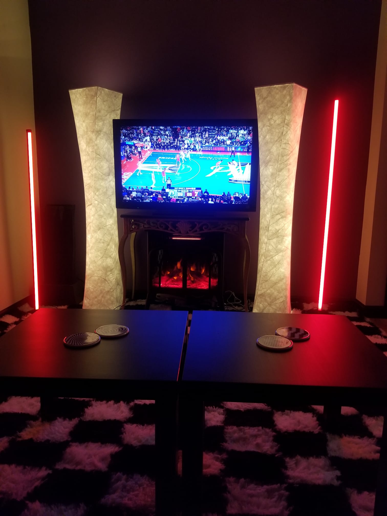 Sink into the reclining sofa, switch on the massaging mat, and cue your favorite film on the Fire TV with streaming apps ready to watch. The bar glows with cool lighting that makes glassware sparkle, while a large side table keeps ice and candles within easy reach. A mini fridge chills drinks and fruit, and a microwave stands by for warm snacks. A salt lamp and essential oil diffuser scent the air as real plants add freshness and oxygen.