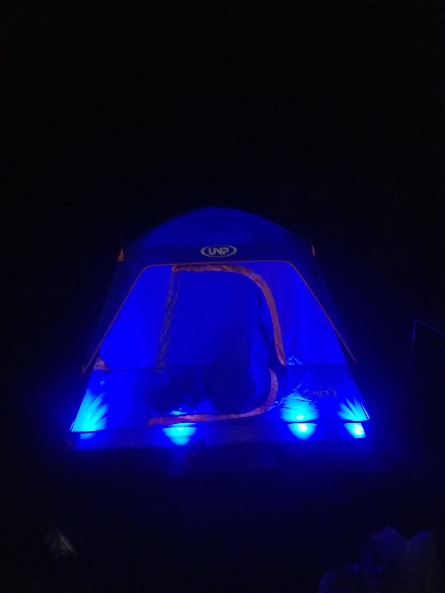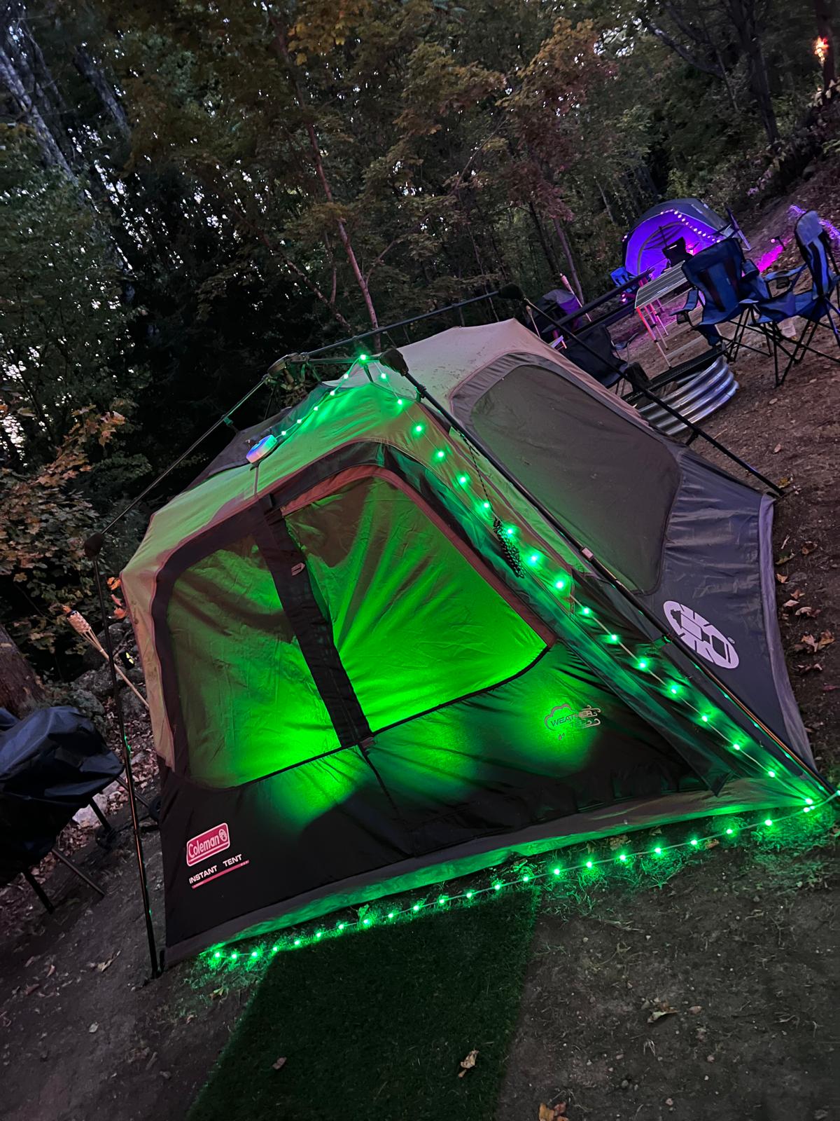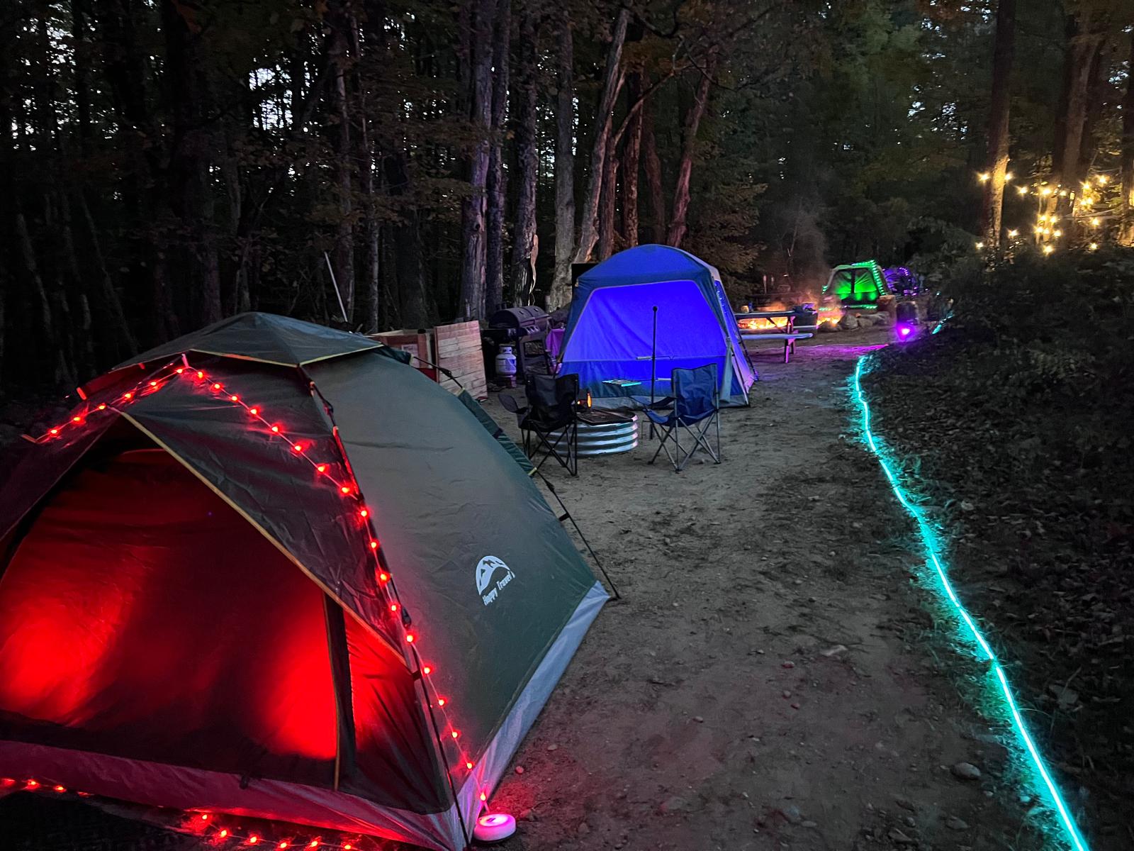 Follow the glow of the LED rope light that traces the clearing to the campsite. Roll right in on the private campsite driveway behind the house, pulling your car up to the site like a seasoned guide. Every campsite is fully prepared before you arrive. A roomy tent stands ready glowing in your color of choice blue, red, green, or pink and each includes soft pillows, warm blankets, an air mattress already inflated, a steady fan for breezy sleep, and a flashlight for midnight wanderings. Camping chairs circle your private stone ringed fire pit beside a solid picnic table, a grill with grate, and a full set of tools so dinner can sizzle over flame or coals. A large hammock hangs nearby for dreamy afternoons.