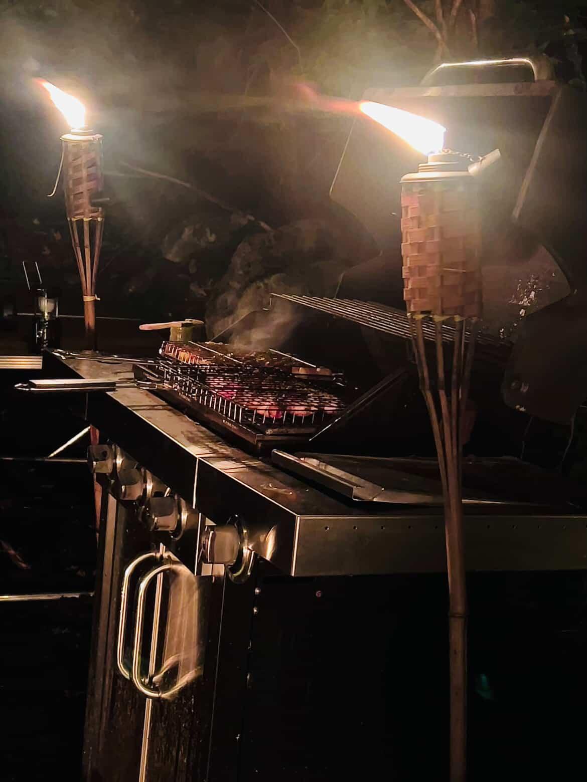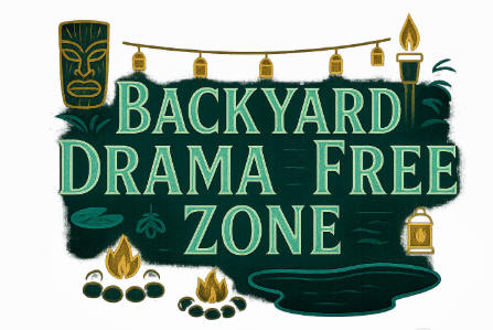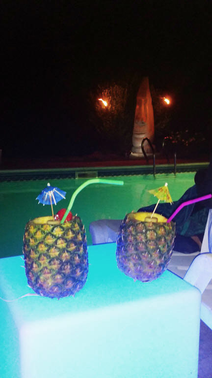 Enter a realm where the backyard feels like a private resort. A vast turquoise pool ripples with color changing LEDs that paint the water in jewel tones while soft rope lights trace the edges like starlight. Fifteen tiki torches crown a glowing bamboo fence, and (2) three hundred pound tiki guardians stand spotlit and majestic, watching over laughter and late night swims.
