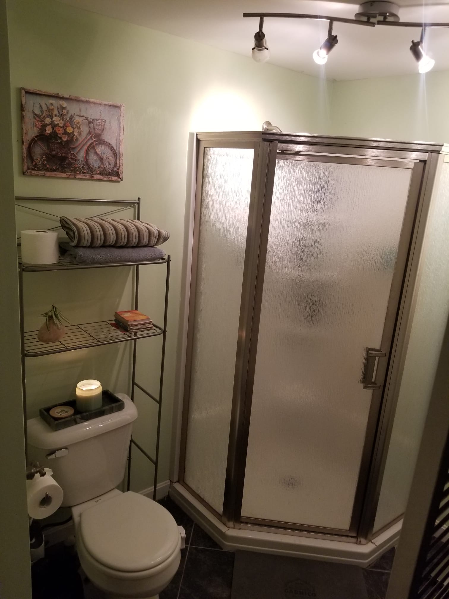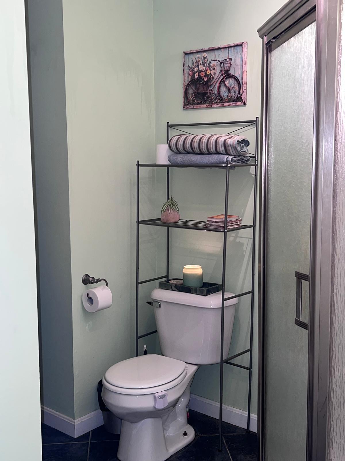 Arrive in a serene haven with soft mint walls and gleaming trim. The room feels spacious and incredibly clean. A frosted glass shower with a brushed nickel frame sparkles under adjustable track lighting. Open metal shelving presents rolled towels, sculptural décor, and everyday essentials. Polished tile floors stay cool underfoot, while an LED toilet light guides midnight visits gently without harsh glare. A large bright window frames the front yard. Discreet washer and dryer add convenience. An instant dry floor mat keeps everything fresh and tidy. You will also find stain sticks, an iron, a steam press, towel closet, and hair dryer to use at your convenience.