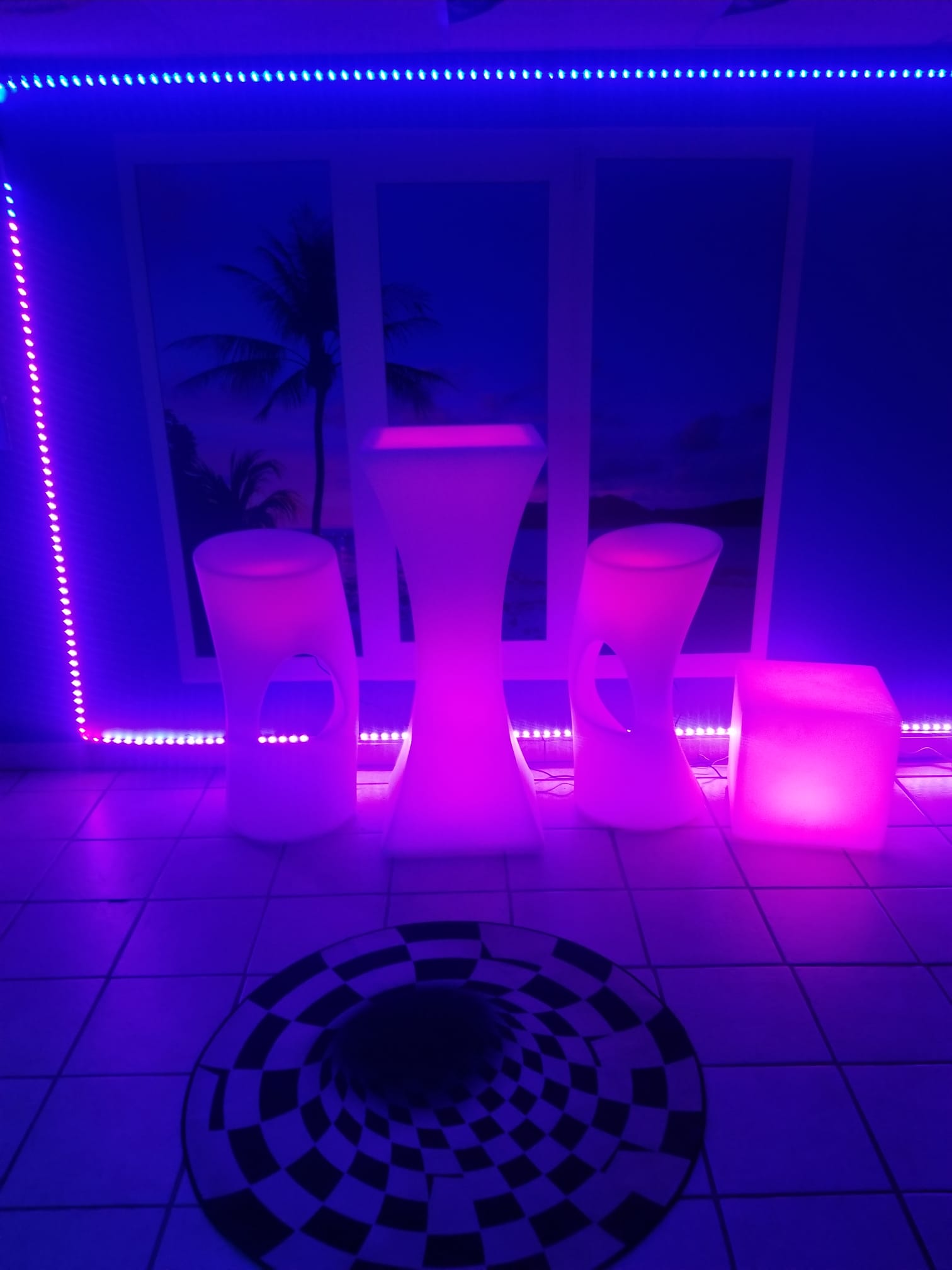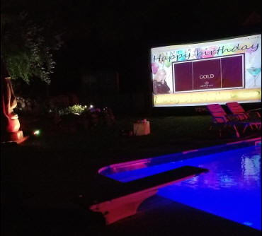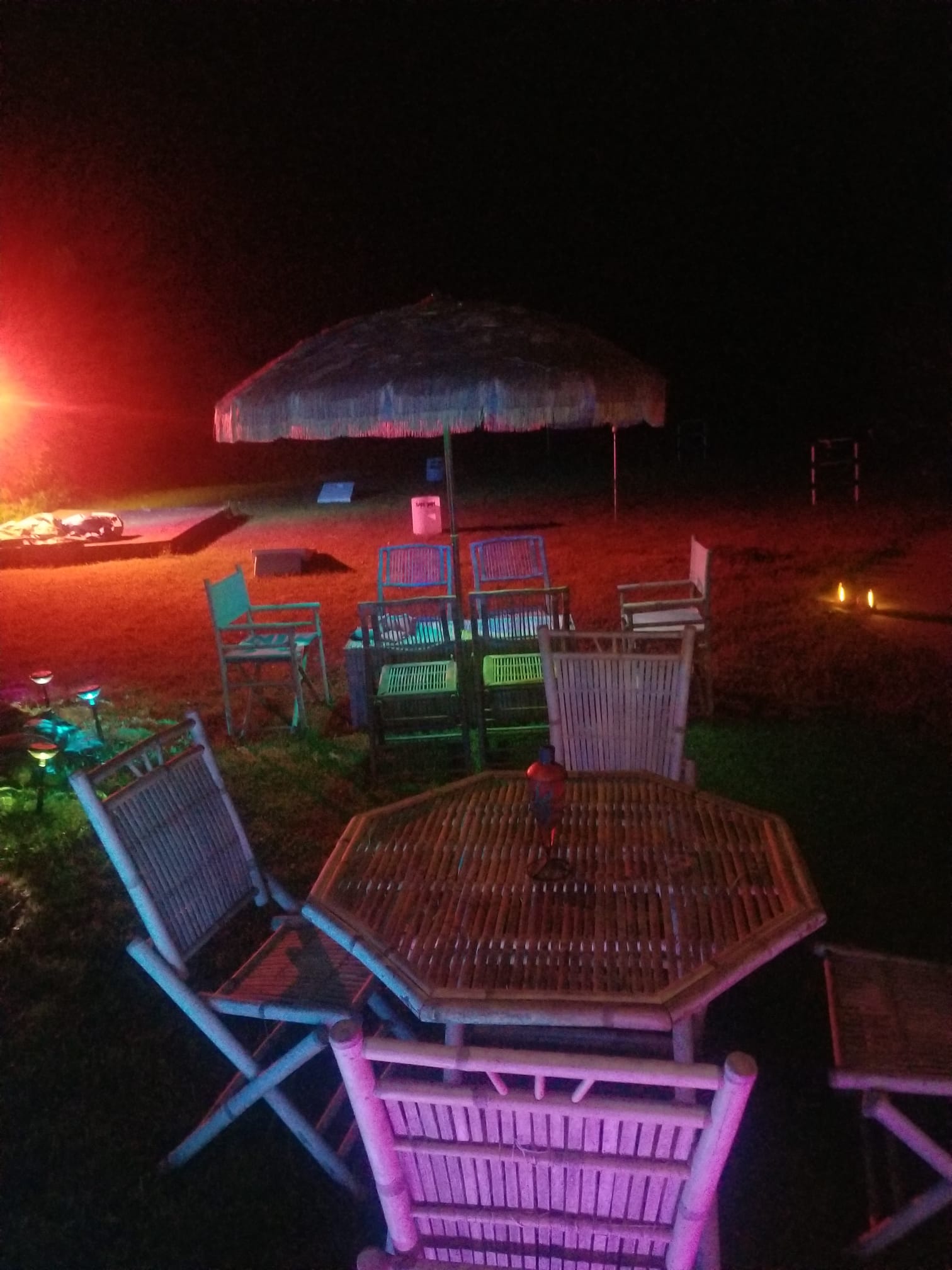 Bamboo furniture echoes the fence and ties the scene together, while pastel Adirondack chairs gather around the water. A raised stage converts to a playful one hole putting green when the band rests. Paper Japanese lanterns sway overhead, and acrylic LED tables and stools glow like modern fireflies. Resort striped towels wait on loungers like cheerful invitations. There is also a Jacuzzi that is on the property but not set up yet.