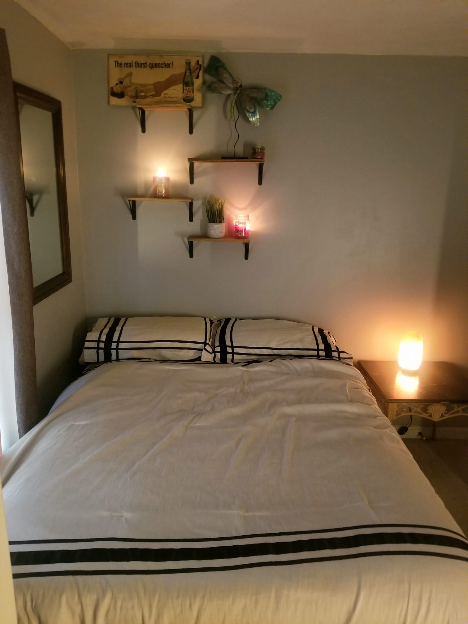Freshly painted and impeccably clean, the space exudes warmth from the moment you enter. A plush, soft rug greets your feet, leading to a luxurious queen-sized bed that promises deep, restful sleep. Beside it, decor shelving, a natural Himalayan salt lamp, and an essential oil diffuser create a calming, health-conscious ambiance that not only smells incredible, but also feels energetically balanced. This is where wellness meets visual harmony.