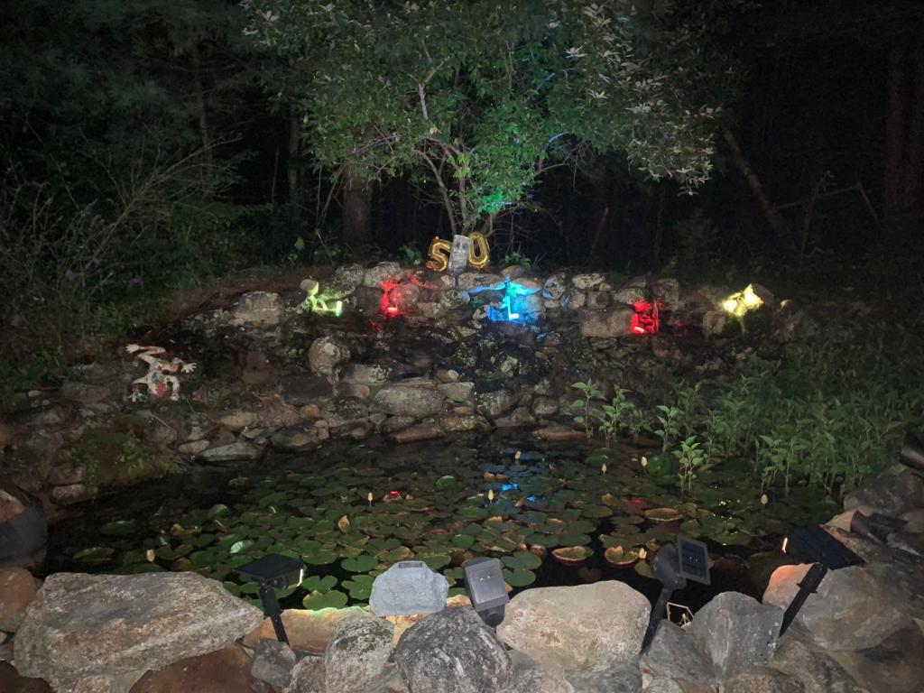 Sip and savor at the pool bar with generous seating, chilled drinks from the pool house refrigerator, and a television made for game nights under the sky. A serene frog pond shimmers nearby, its solar lights revealing lily pads and a gentle waterfall whispering peace. A ring of stones defines the firepit, with discreet path lighting that highlights the larger rocks to keep every step safe.