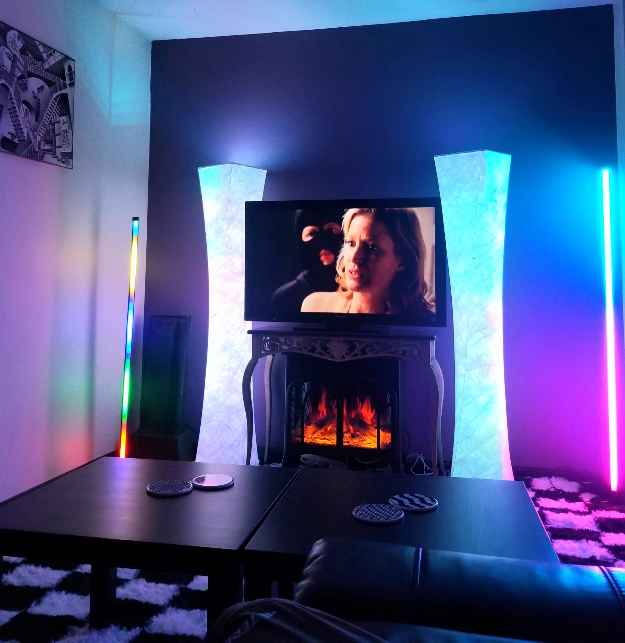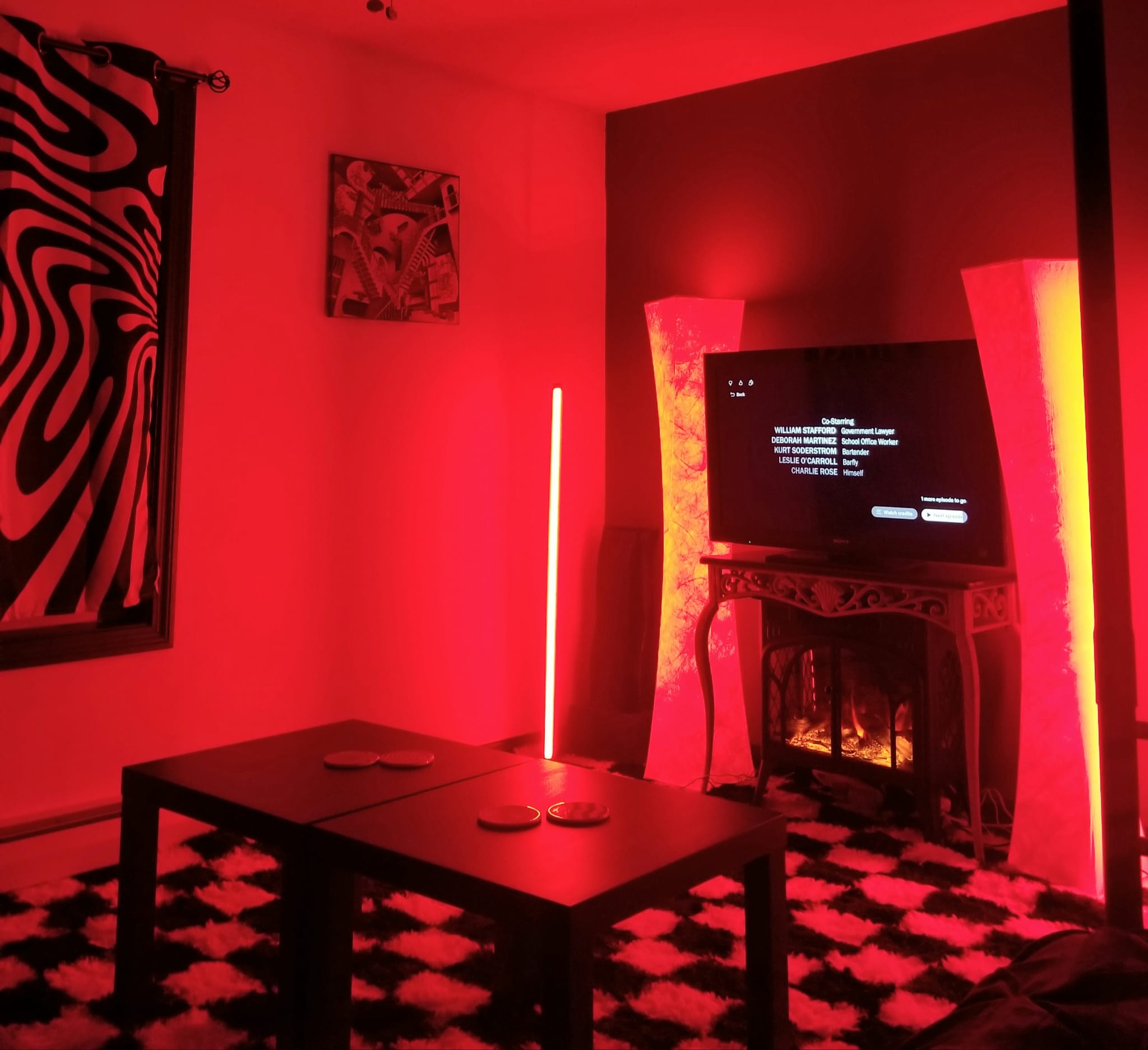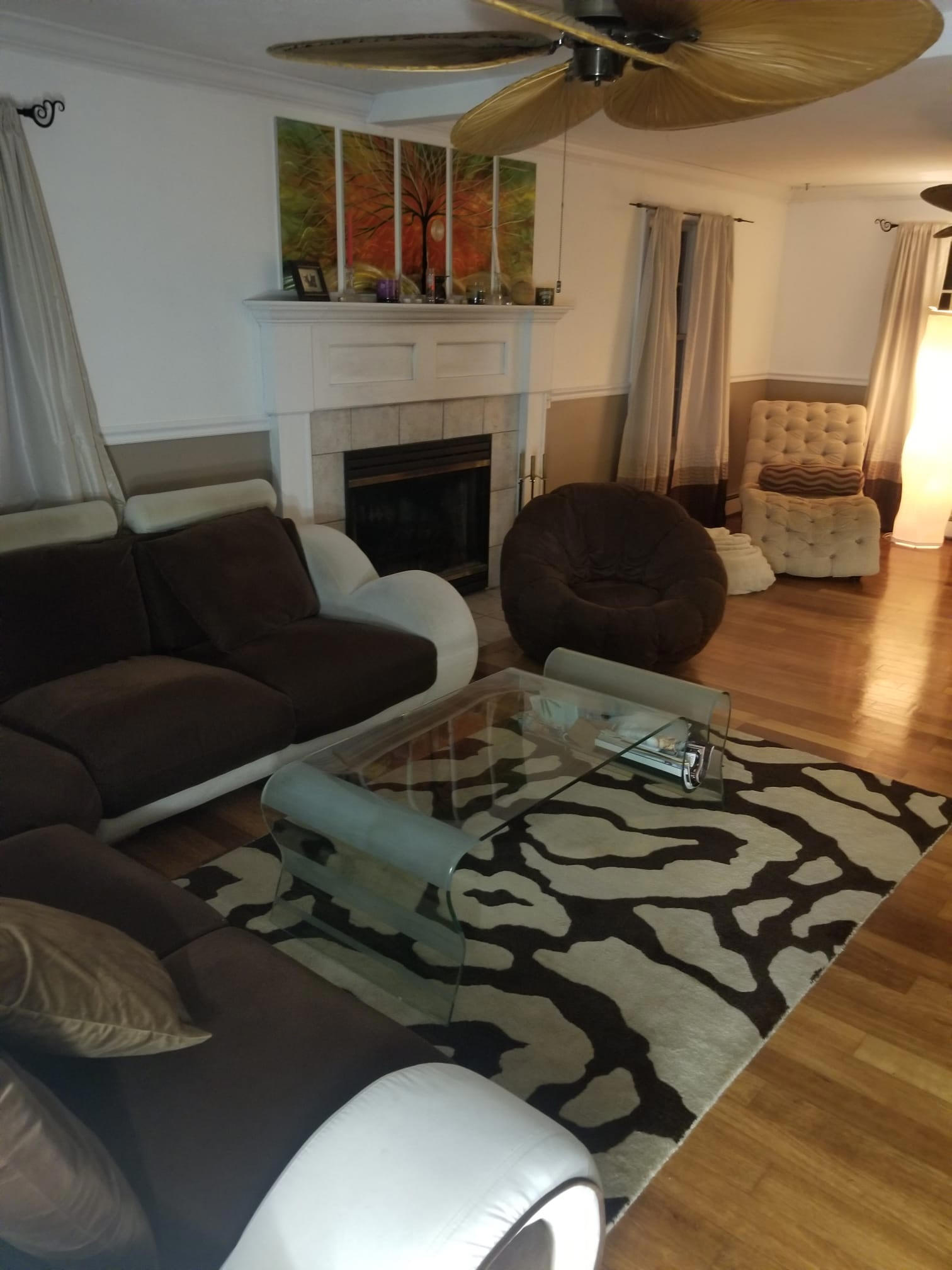 Step into a living room that feels like an art deco daydream. Sculptural furniture with playful Dr. Seuss shapes that set the vibe, from the curvy entertainment center and statement coffee table to a one of a kind couch with elegant flowing lines. Palm frond ceiling fans stir the air, the fireplace glows for winter nights, and soft floor lamps wrap the whole space in a warm, inviting light.