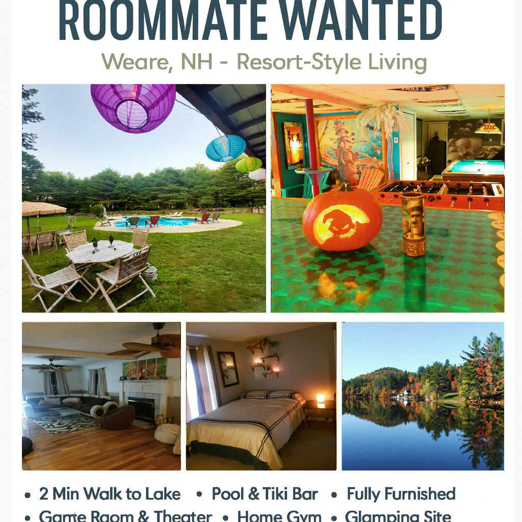 Hello my name is Jason and I own a home in Weare NH. If you received this link it is because I am looking to rent a room and you are looking for a room. This is more than a room. It is a peaceful, well kept home base where daily life feels like vacation. A beautiful lake is only a 2 minute walk away for sunrise paddles, evening swims, fishing or just chilling in the middle of a lake in a canoe. On property you can camp in style at a prepared campout area with glowing tents, a giant pallet burning bonfire, private fire rings, and easy access to gear. The backyard opens into a dramatic oasis with an in ground pool, tiki ambience, seating, outdoor bar, and space to grill with friends. Inside, the finished basement transforms into a cinematic sports lounge with games and a massive movie screen. The kitchen is spotless and fully equipped for real cooking. Work or train without leaving home in a true gym stocked with free weights, benches, machines, treadmill, and elliptical. High speed internet, laundry, and plentiful storage make everyday living simple. Set between Manchester and Concord in quiet, scenic Weare, you will enjoy four season fun from nearby ski areas to summer hikes and fall foliage. Clean, respectful roommates and a drama free atmosphere complete the picture. If you want a furnished place that adds joy to your routine, you have found it.