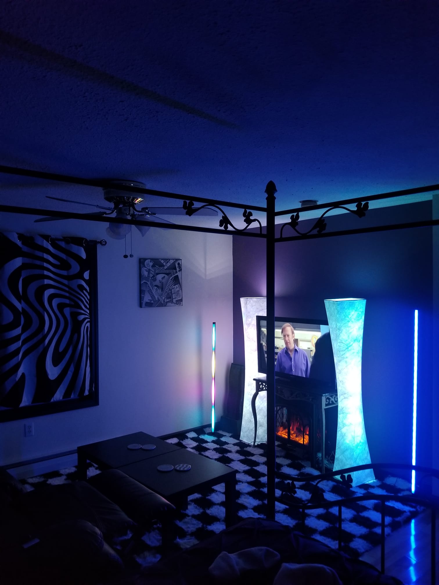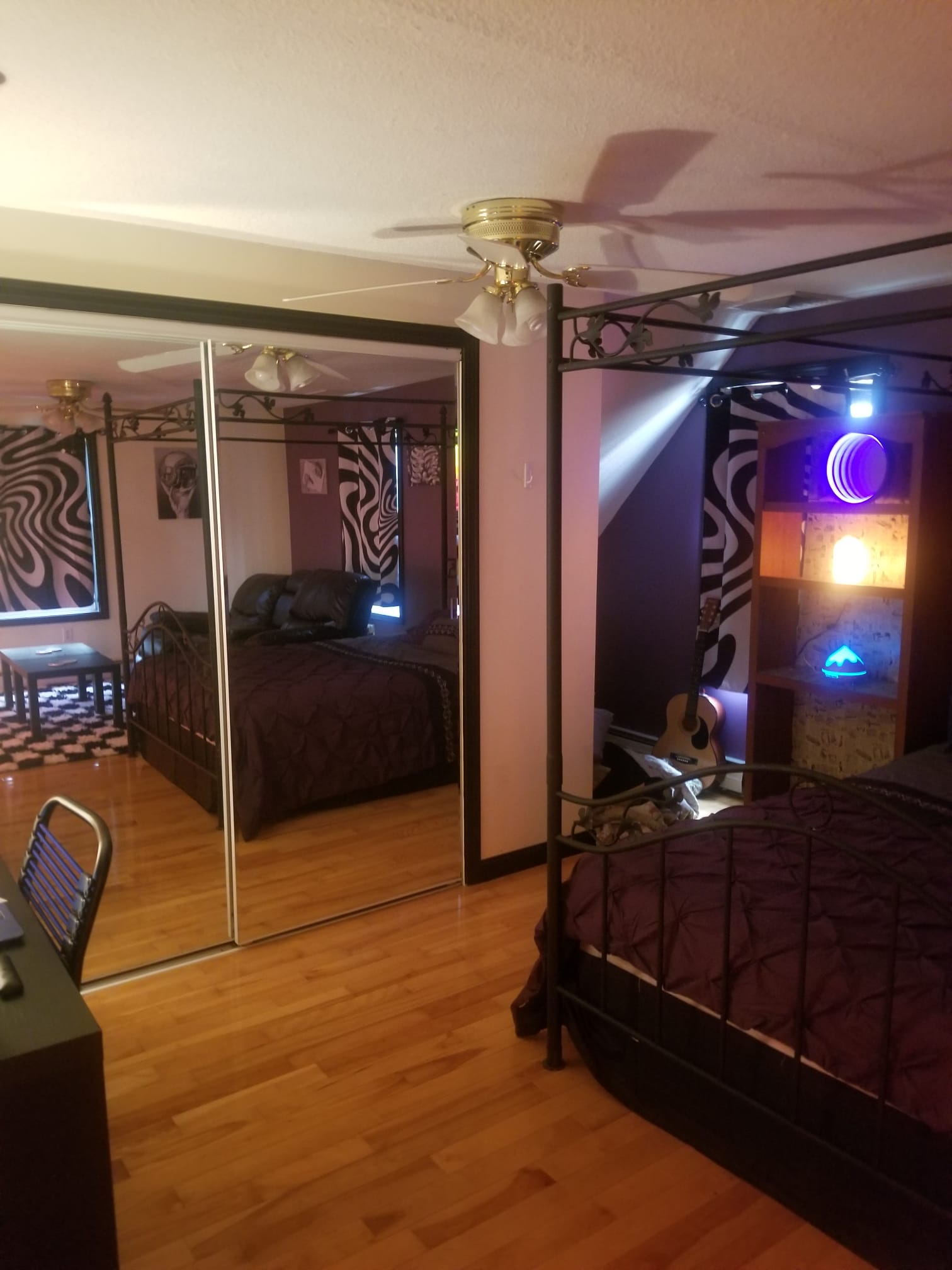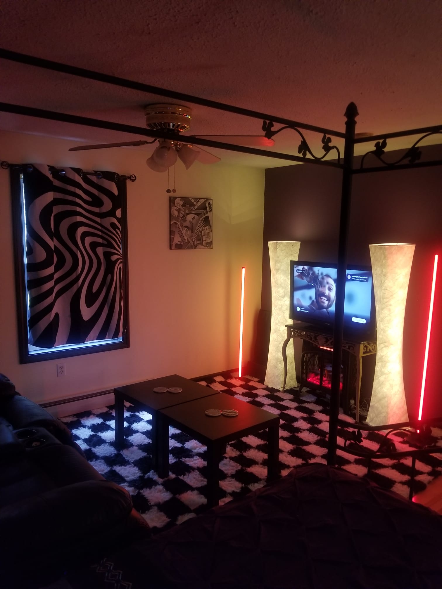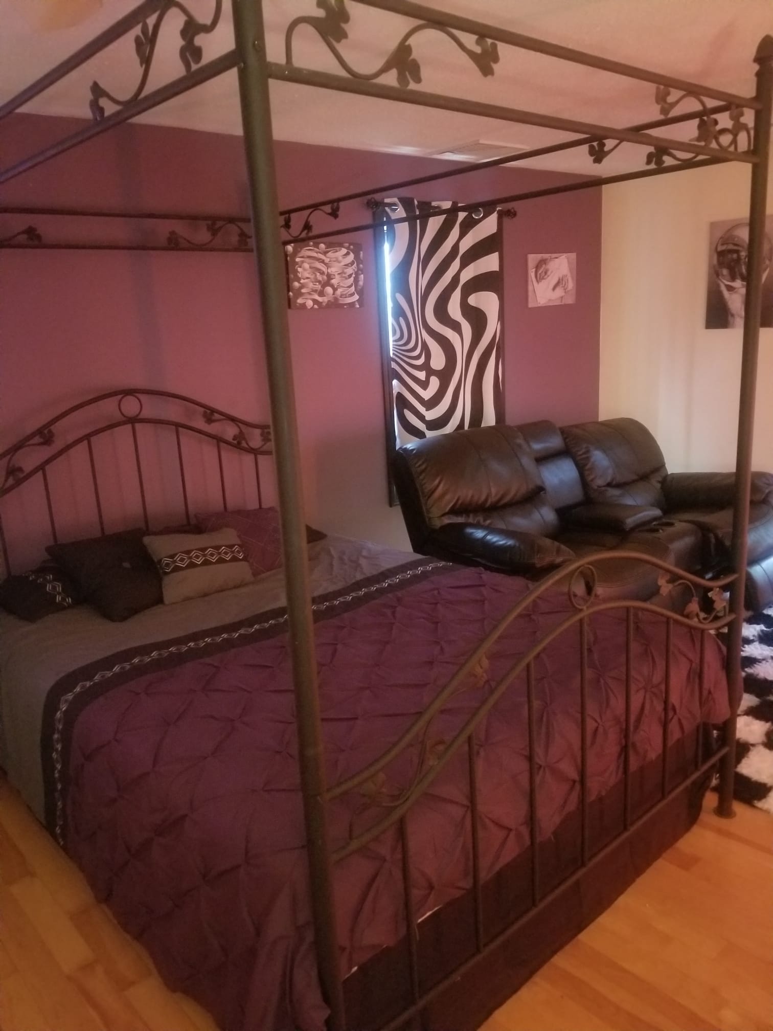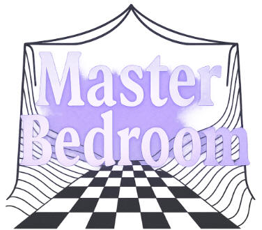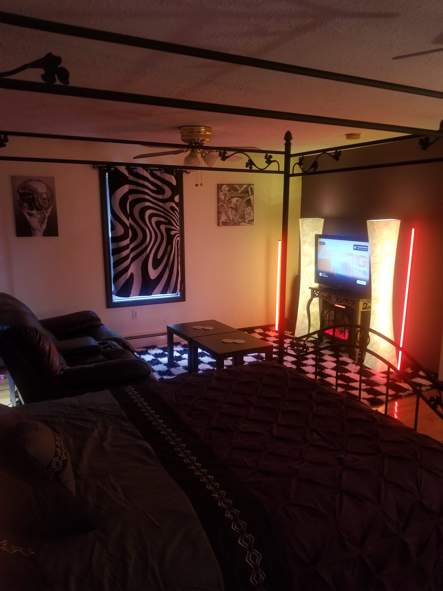 Step into a dreamscape master suite where surrealist design meets everyday ease. Walls bloom in soft lavender against crisp white, framed by dramatic black trim. Underfoot, a plush black and white checkered shag rug invites bare feet. A sculptural canopy crowns the king size bed, layered with decadent bedding that feels hotel fresh. Curtains ripple with black and white illusion patterns. The art is MC Escher and all of the pictures are black and white which makes any color in the room really pop