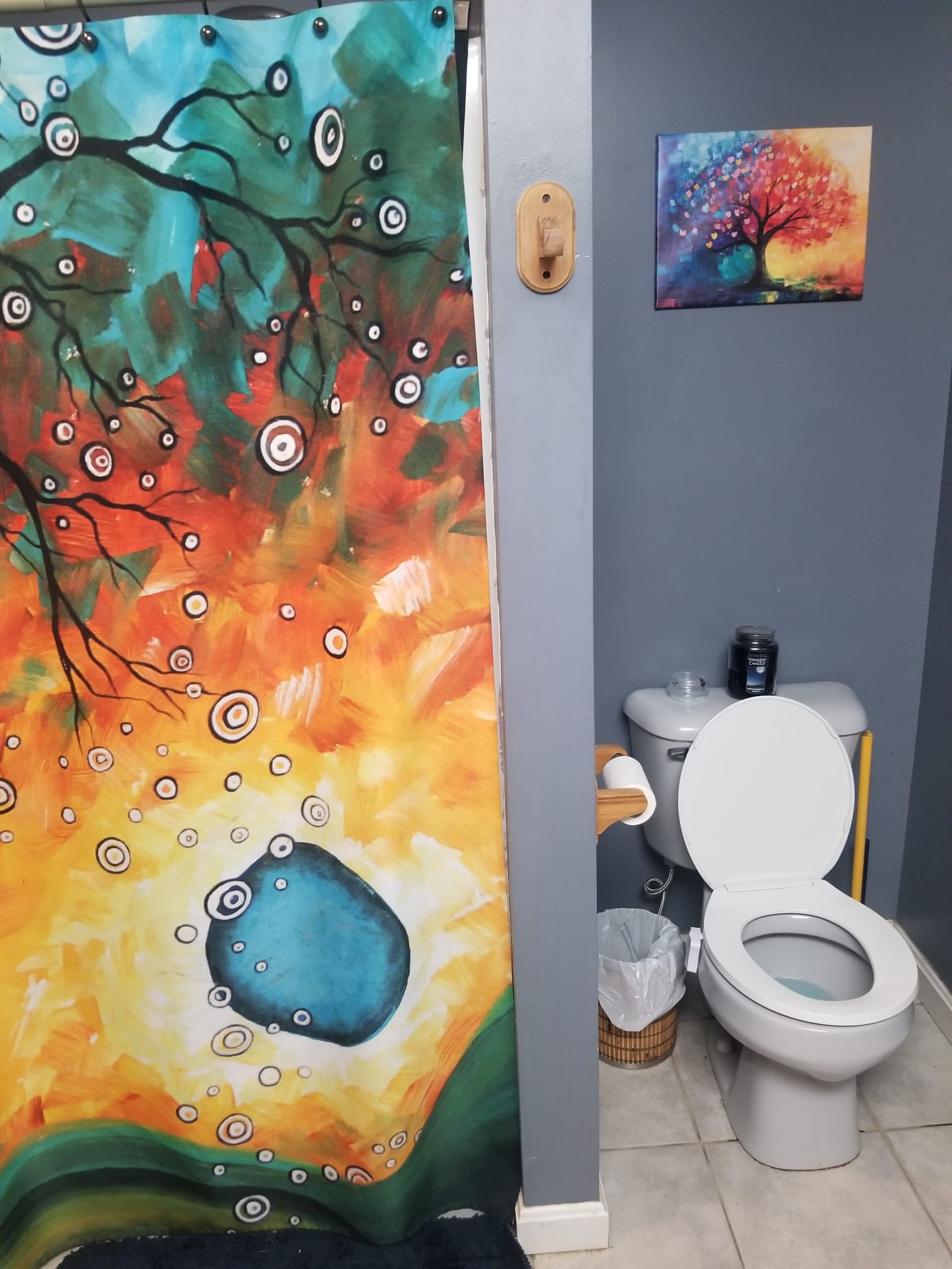 The space serves the two upstairs bedrooms and stays cheerful and colorful throughout the day. Water pressure is luxurious and the hot water keeps flowing, whether you are enjoying a quick rejuvenating shower or sinking into a mineral bath. Set candles around the tub, rest your head on the cushioned bath mat, and let the stress dissolve.